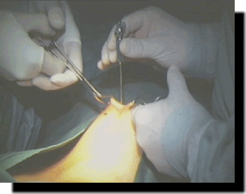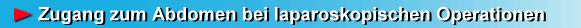 Nachdem 12 mm Hg Insufflationsdruck erreicht sind, wird die Veres-Nadel entfernt und der vorher auf seine Funktionstüchtigkeit geprüfte sogen. „Sicherheitstrokar" wird wiederum in streng senkrechter Richtung unter Halten der beiden Backhaus-Klemmen mit leicht bohrenden und drehenden Handbewegungen in das Abdomen eingebracht, bis ein Schnapp-Phänomen zu hören und zu spüren gewesen ist. Abschliessend folgt die Konnektion des Trokars mit dem Gaskabel und Gsinsufflation, danach wird die Optik eingeführt und das Abdomen sofort auf intraabdominelle Verletzungen im Einstichbereich geprüft. Danach kann mit der eigentlichen Operation begonnen werden.