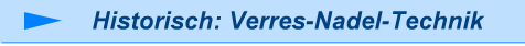 Sicherlich etwas polemisch - aber wir sind militante Vertreter der offenen Zugangstechnik ! Aus unserer Sicht gibt es kein Argument mehr für diese umständliche und potentiell gefährliche, aus unserer Sicht prähistorische Zugangstechnik. Deshalb werden Sie in unserer Klinik auch keine Veres-Nadel finden ! Trotzdem muss man diese Technik noch kennen und aus diesem einzigen Grund finden Sie hier diese Beschreibung. |