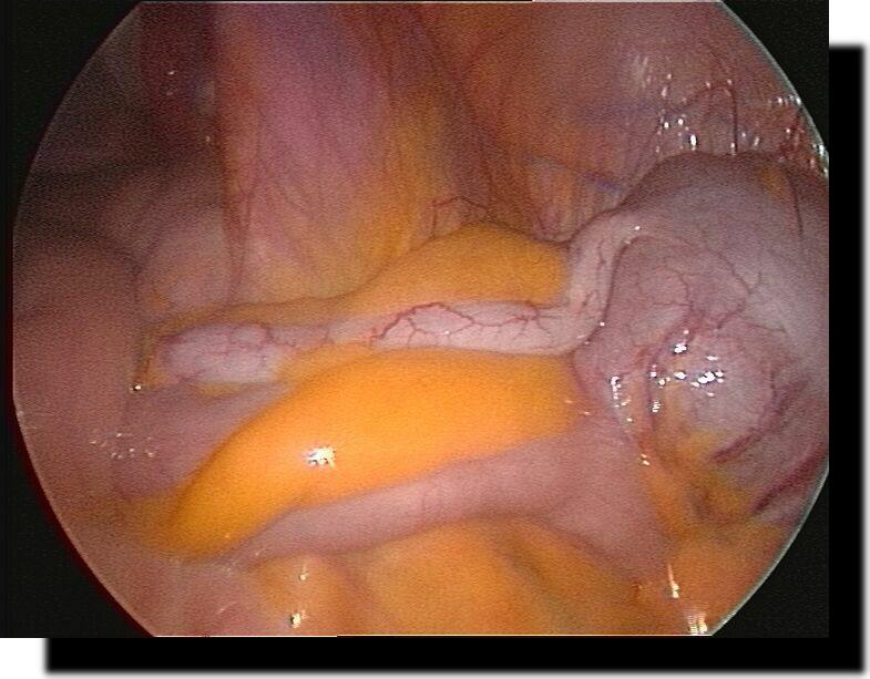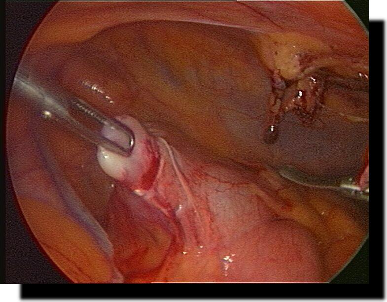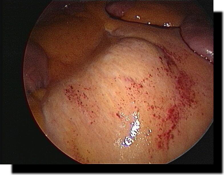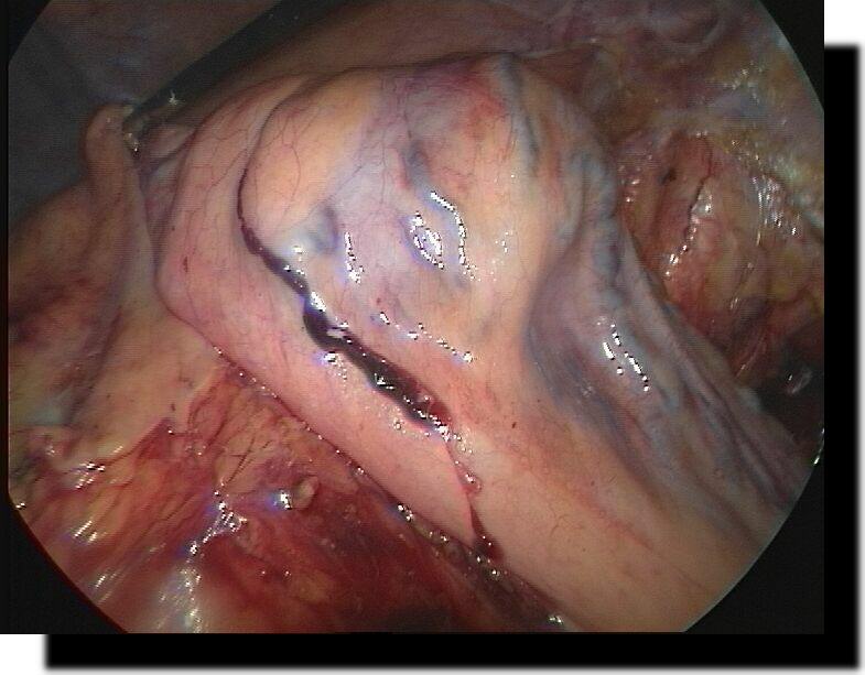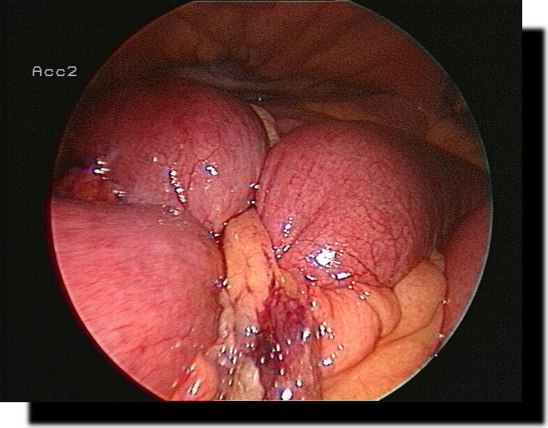 Operationsablauf Zugang durch offene Laparoskopie (s. o.) i.d.R. durch 10mm Stahltrokar im Nabelbereich. Nach Insufflation des Pneumoperitoneums zunächst orientierender Rundblick und Ausschluss von Verletzungen. Einbringen eines 5 mm Stahltrokars im Bereich des rechten Mittelbauches in der Medioclavikularlinie oder an anderer Position im rechte oder linken unteren Quadranten (s. Zeichnung). Dann schrittweise Exploration des Abdomens mit der Johan-Klemme unter entsprechender Lagerung der Patienten (Kopftief-, Fusstief-, Rechtsseit- und Linkseitlagerung). Bei unklarem oder akutem Abdomen weiteres Vorgehen nach Befund (z.B. Laparotomie, Appendektomie, Übernähung Magenperforation, etc.). Bei der Staging-Laparoskopie des Magenkarzinoms wird dann die Leber inspiziert und mit dem Taststab palpiert, um Lebermetastasen zu finden bzw. auszuschliessen. Anschliessend wird der linke Leberlappen mit dem Taststab angehoben und die Magenvorderwand, die kleine Kurvatur, das kleine Netz und die Kardia mit dem Hiatus ösophagei eingesehen und palpiert. Falls erforderlich, wird hierfür ein weiterer 5 mm Trokar im linken Mittelbauch eingebracht. Bei V.a. Tumorgewebe wird eine Biopsie mit der Biopsiezange entnommen. Falls erforderlich werden noch Biopsien aus verdächtigen Peritonealbezirken an den Zwerchfellkuppeln oder anderer Lokalisationen entnommen. (Falls erforderlich, wird nun die grosse Kurvatur über 5-8 cm skeletiert und die Magenhinterwand inspiziert.) Nun sollte eine Stadieneinteilung (z.B.: lapT1-4, lapN1-3, lapM0-1) nach den vorliegenden Befunden möglich sein und entsprechend festgelegt werden, insbesondere sollten nun die entsprechenden Endosonographiebefunde korreliert und ggf. korrigiert werden. Entfernen aller Instrumente und Fasziennaht im Nabelbereich. Subcutane Lokalanästhetika-Infiltration mit Carbostesin 0,25% und intracutane Hautnaht. Verband. Histologische Untersuchtung. Eine Antibiotikaprophylaxe ist in der Regel nicht erforderlich. |